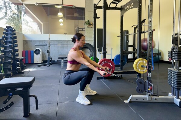 Place cable pulley at a medium height position, with a small bar attached. Grab hold of the bar and step back, facing the pulley. Place feet approximately shoulder width apart. Stand up tall and keep your arms straight. Pull the bar in towards you until it touches your torso, focusing on squeezing your shoulder blades together. Return until your arms are extended.